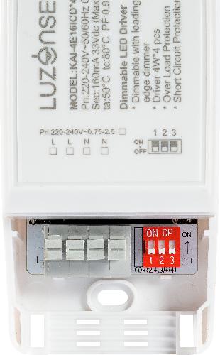 Driver for opptil 4stk UnoCob 4W 160mA. Viktig å sette første armatur på høyre side merket +-. Neste UnoCob settes på merking +-1, og dip-switch #1 settes i posisjon ON. For 3. UnoCob settes da på +-2 og dip-switch #2 settes i posisjon ON. For 4.UnoCob settes på +-3 og dip-switch #3 settes i ON posisjon