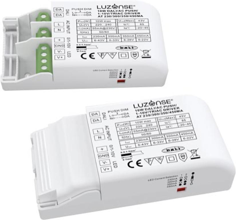 Nyutviklet universaldriver som kan styres med fasedimmer, push/impuls, 1-10V eller med DALI. Ferdig innstilt på 350mA tilpasset Unilamps downlights. Leveres med 5-polet Linectboks.