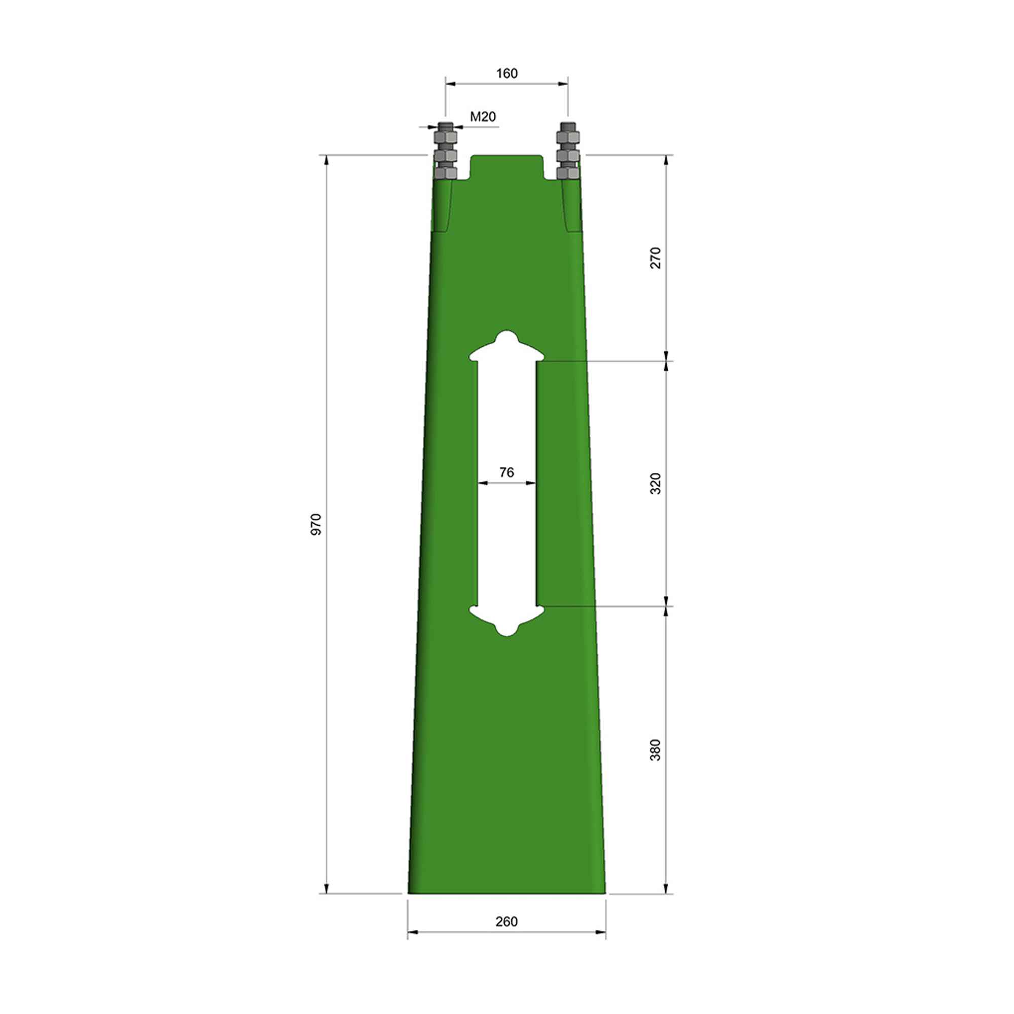 Fundamentet har tosidig kabelinnføring med valgfri høyde på kabelinntak, spaltebredde 76mm. Det er mulig å koble til trekkerør ø110 ved hjelp av trekkerørsmuffe. Boltene er utskiftbare og mastens fotplate vil dekke fundamenttoppen.